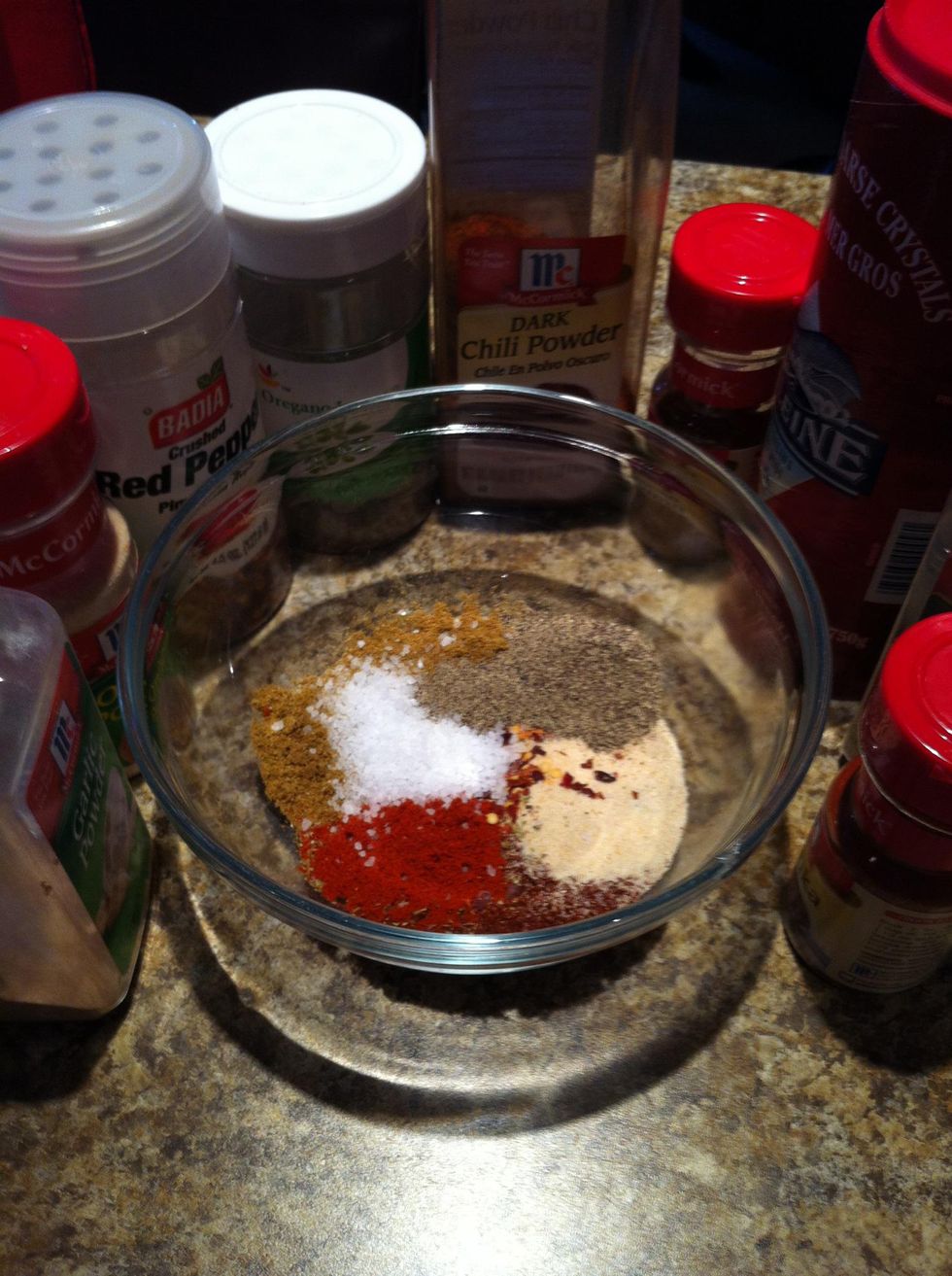 1 Tablespoon chili powder 1/4 teaspoon garlic powder 1/4 teaspoon onion powder 1/4 teaspoon crushed red pepper 1/4 teaspoon dried oregano leaves 1/2 teaspoon paprika 1 1/2 teaspoon ground cumin 1 teaspoon sea salt 1 teaspoon ground black pepper