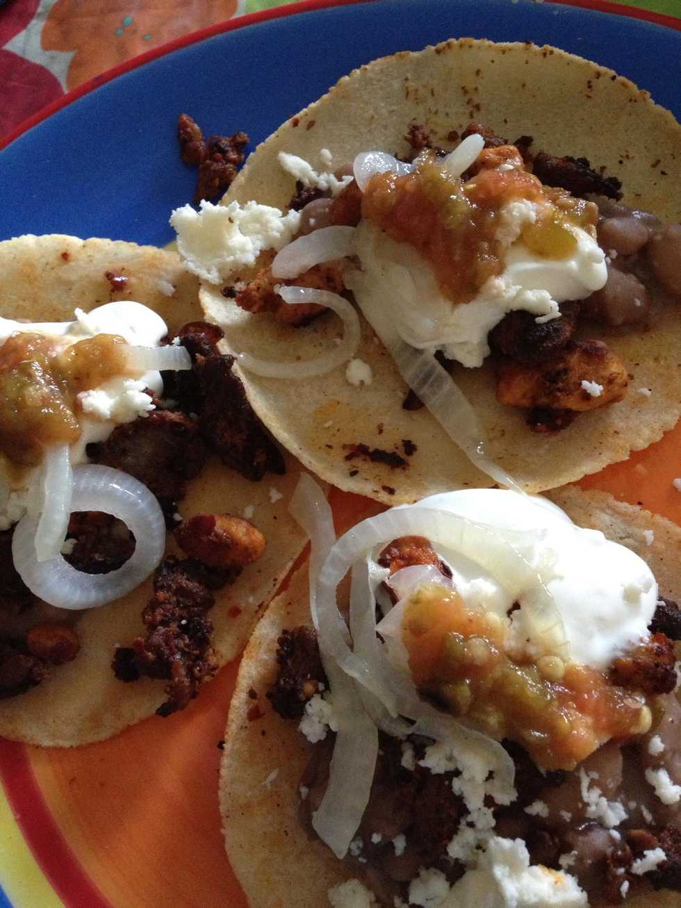 Prepare all of your veggies, salsa, frijoles and then make your homemade tortillasSauté onionsCook both meats together thenMake a taco. Enjoy!