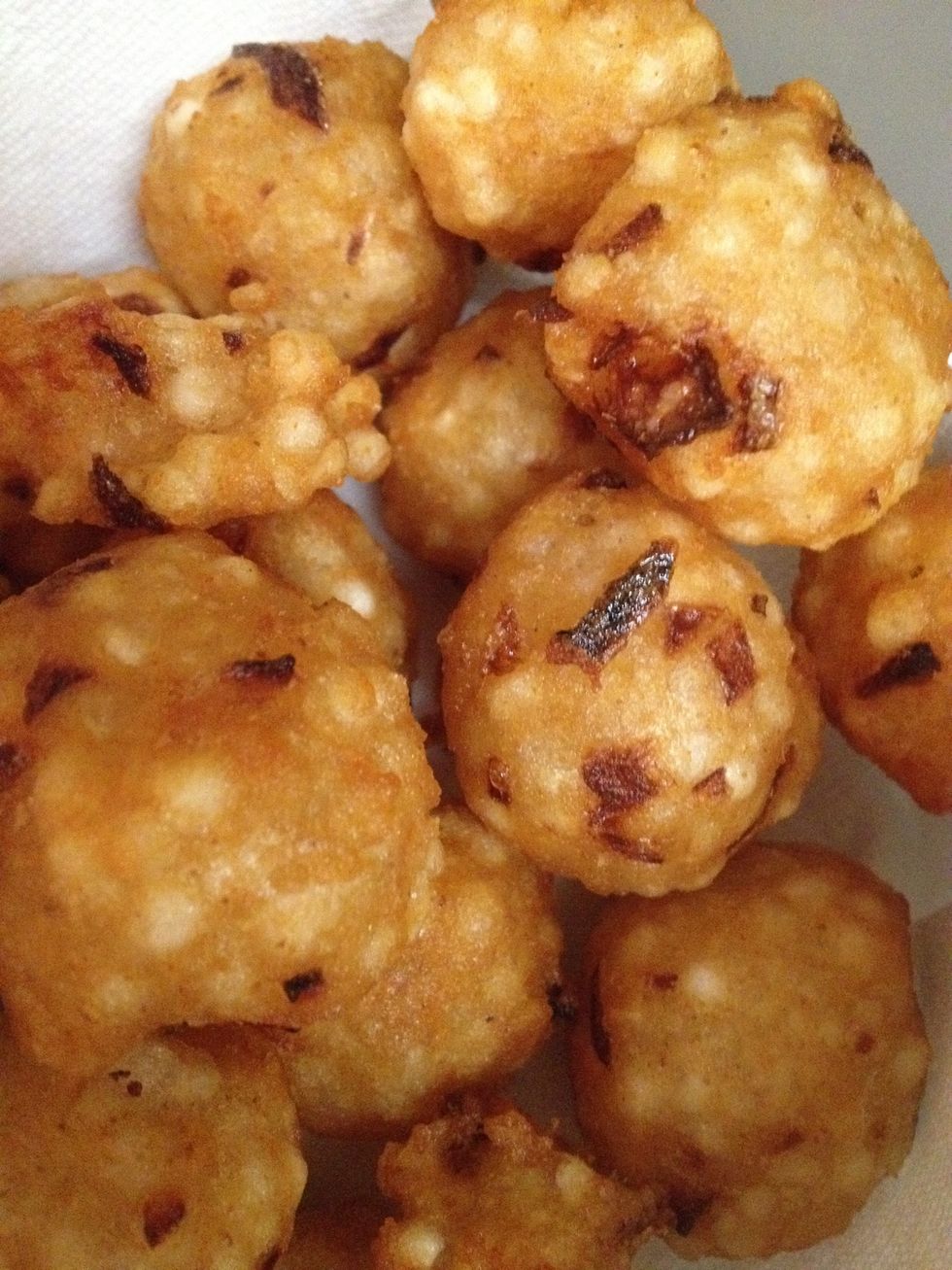 Make small balls with the batter we made and start frying. These might stick but don't worry once they get half aw cooked you can break them off with a spoon.