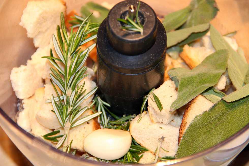 Put in blender your stale bread, a clove of garlic, sage and rosemary. Pinch of salt