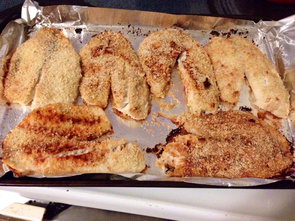 Since I baked my fish, I sprayed some coconut oil on a aluminum foiled cookie sheet. If you want to pan fry, I highly recommend a generous amount of coconut oil cooked on med-high heat.