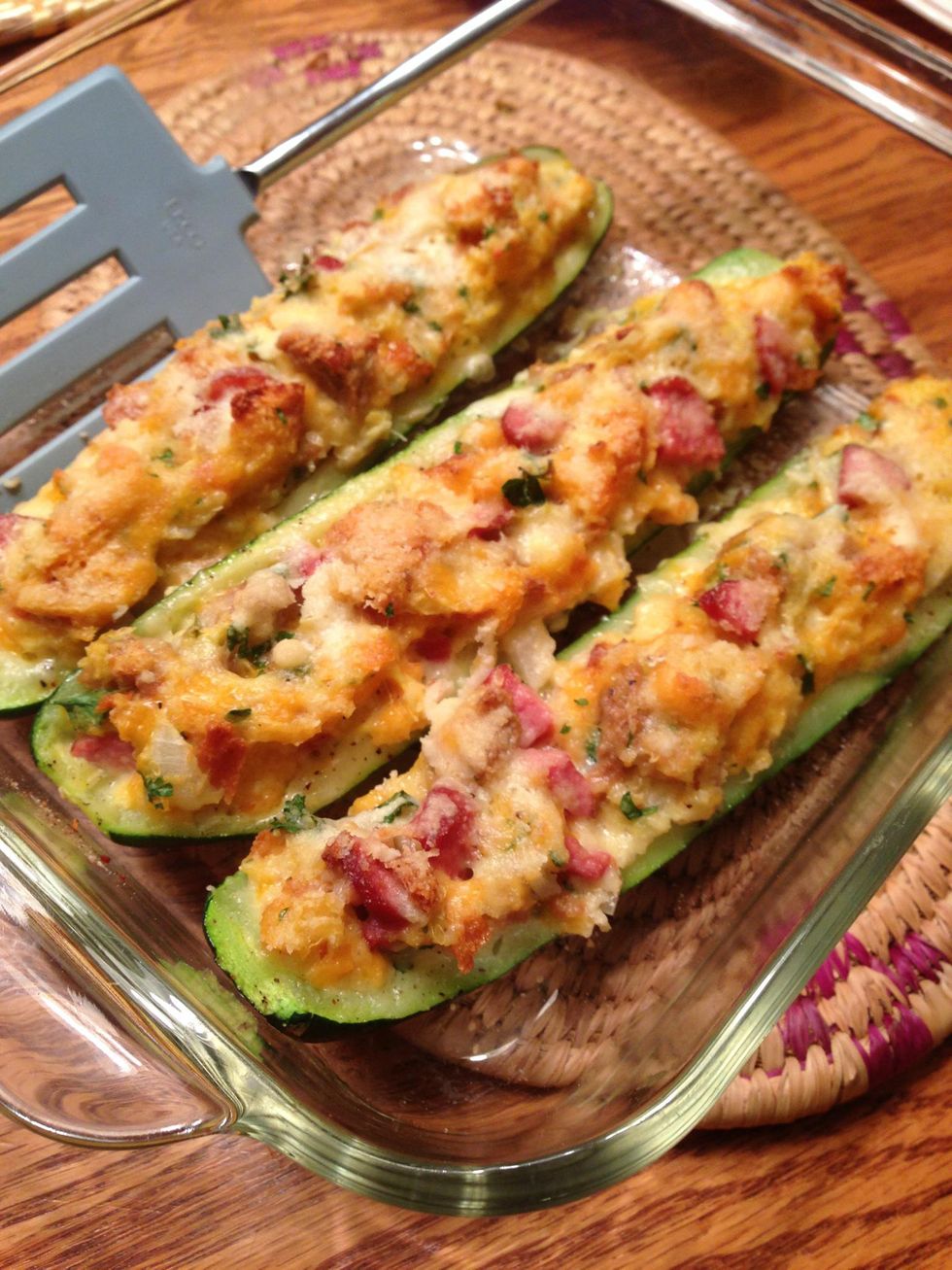 Spoon mixture into zucchini shells, mounding.