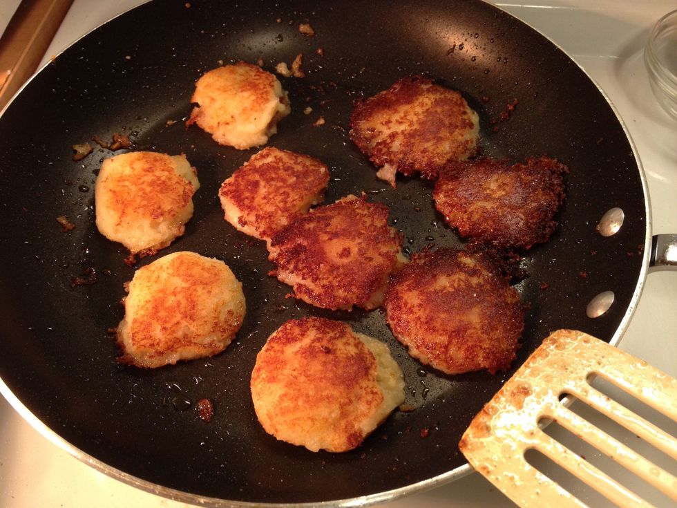 Fry in olive oil. Too much oil and the tater platz will fall apart. Too little oil and they won't brown up crispy. (This was a little too much oil)