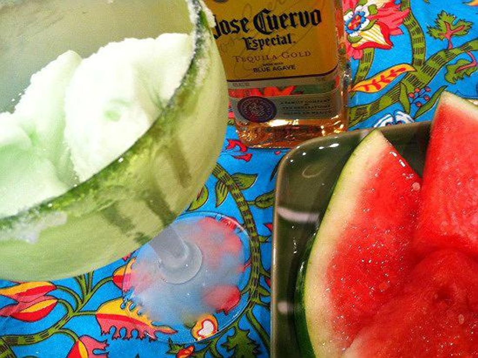 I was so enamored with the way tequila so easily pairs with the sweetness of watermelon, that I made this for desert---Tequila Sherbet. Rub the rim of a margarita glass with a lime wedge.