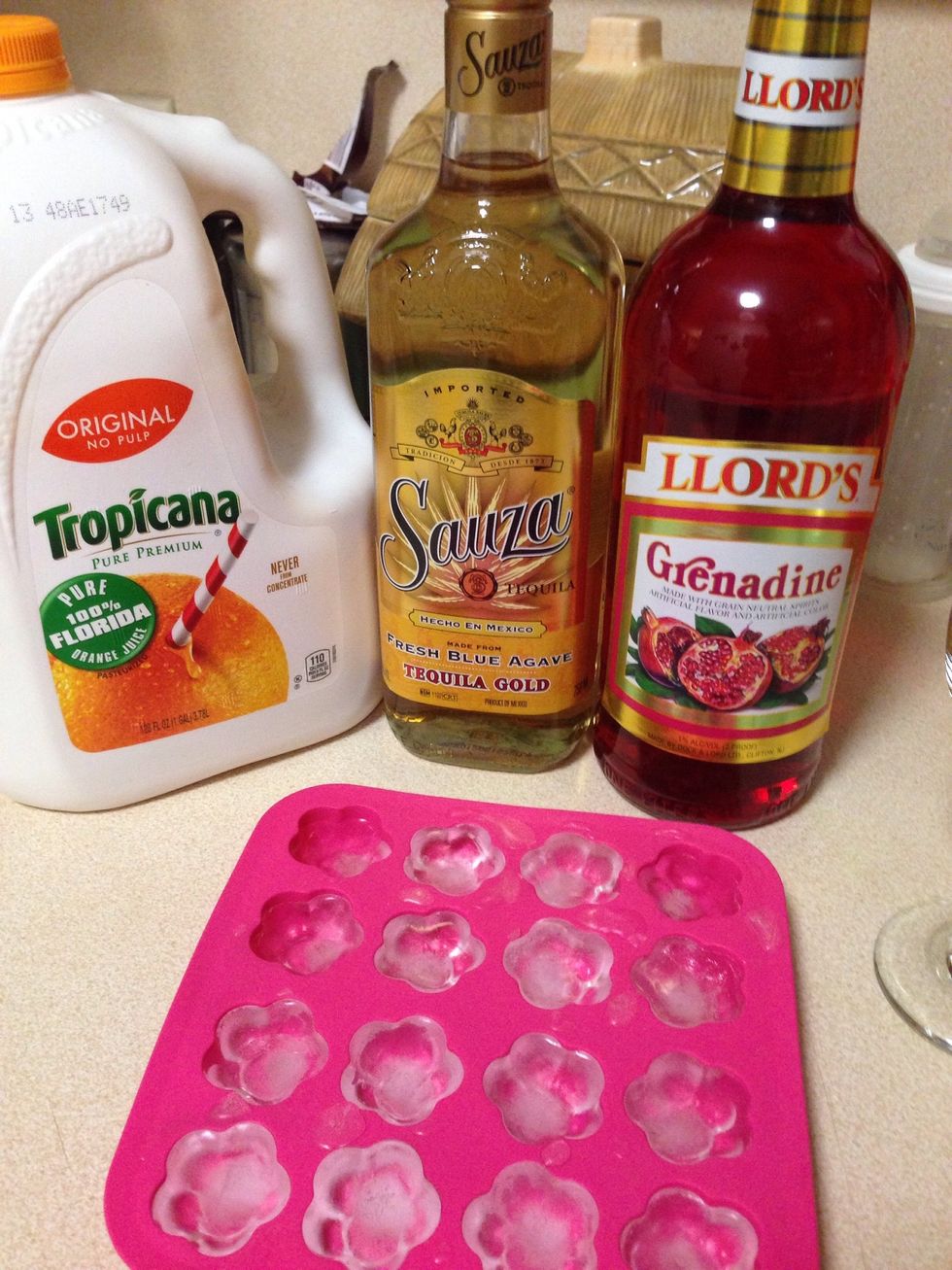 In a glass put ice, tequila and orange juice, then tilt the glass and slowly pour 2 dashes of grenadine along the edge of the glass. Making sure it goes straight to the bottom.