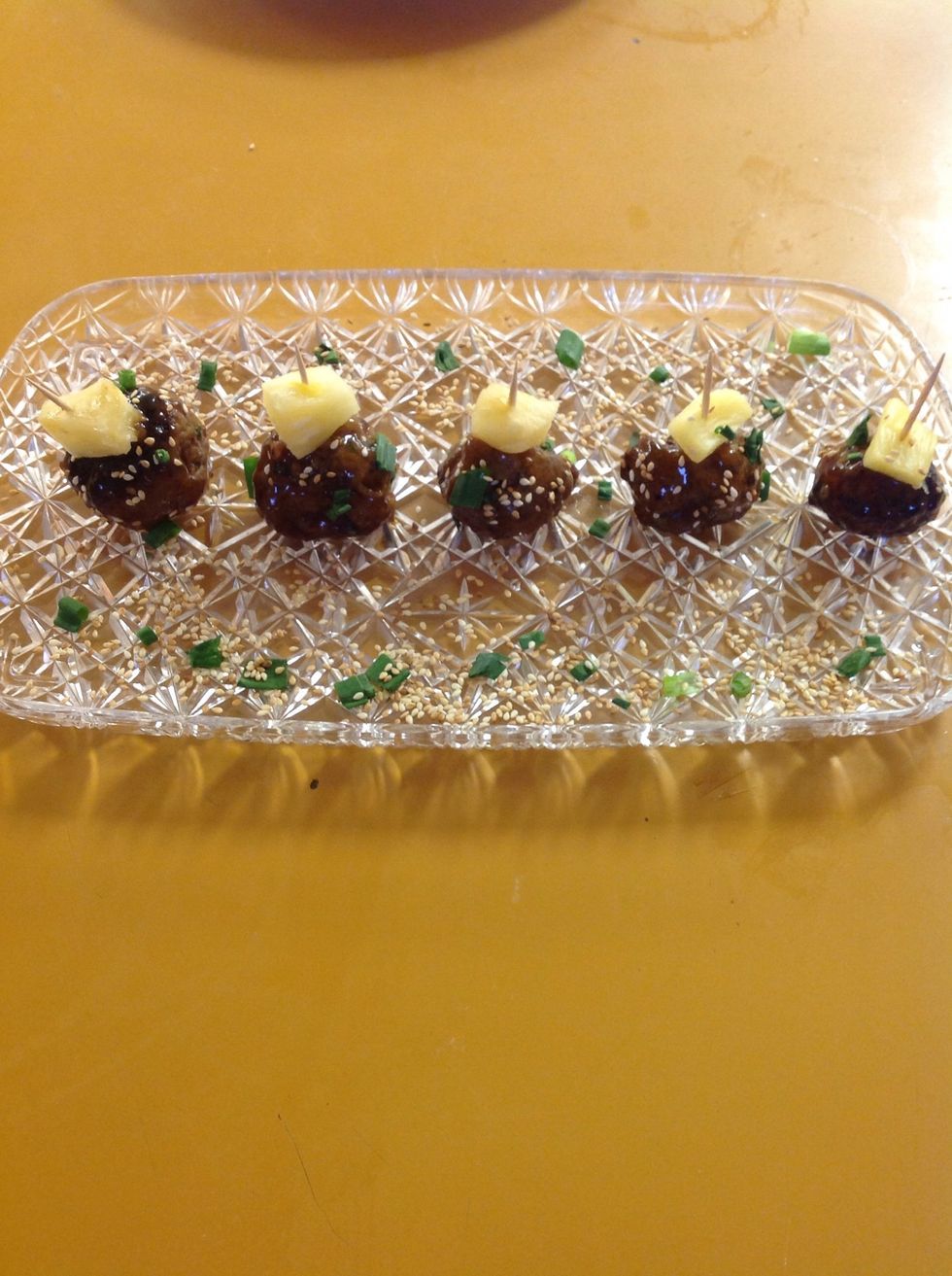 Put one piece of pineapple on a tootle pick, make as many toothpicks as you have meatballs.