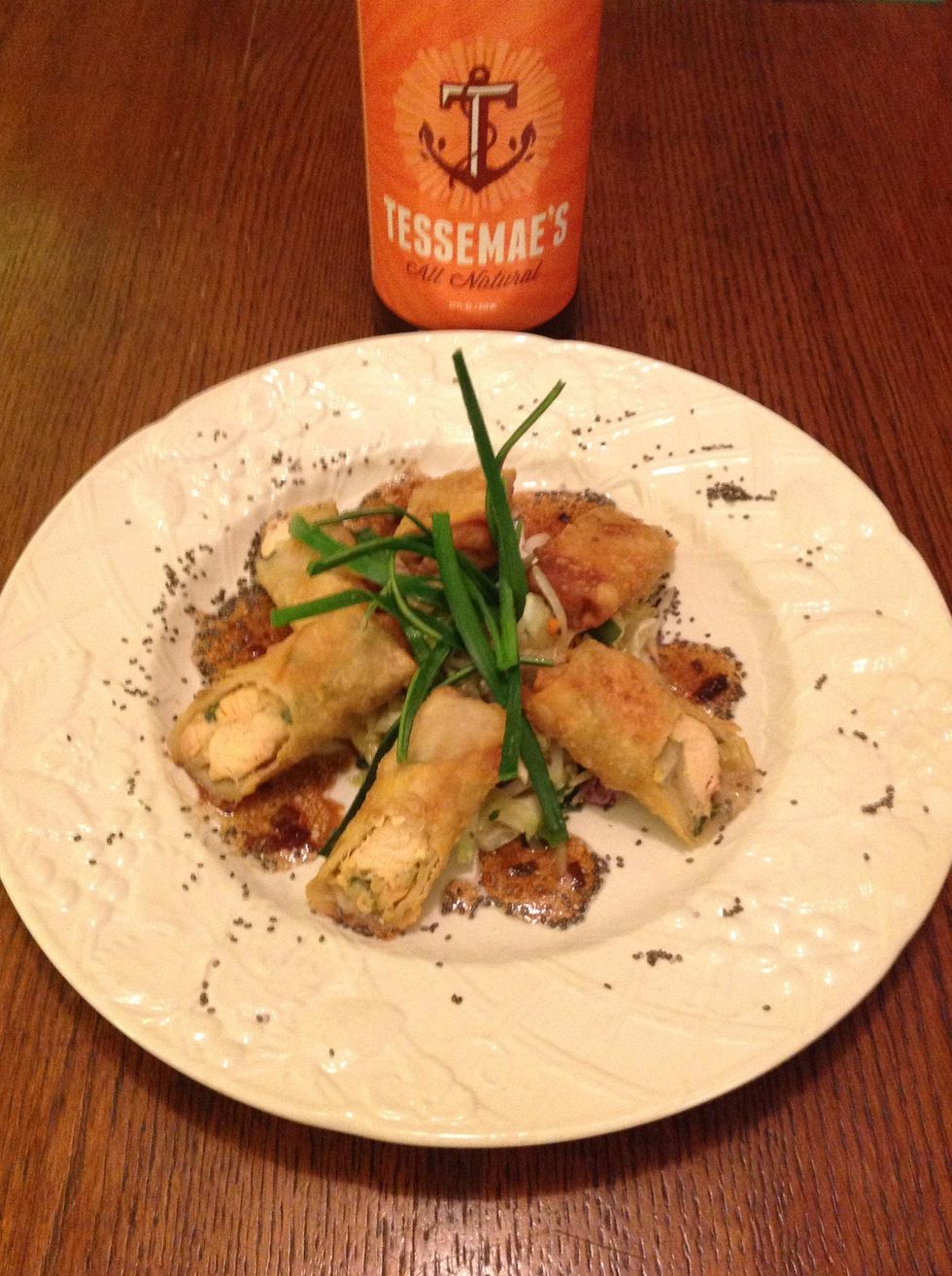 I served egg rolls on top of a shredded slaw mix that I tossed with Tessemae's Soy Ginger. Then drizzled the sauce I made while rolls were frying and garnished with Julian style leeks and sesame seeds