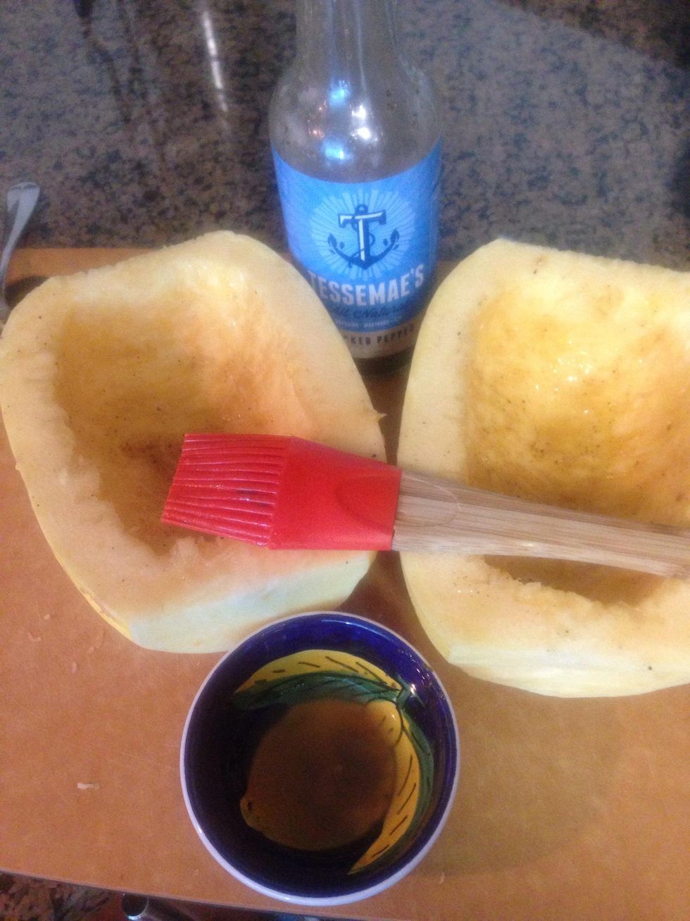 Scrape out the middle core and seeds. Wash seeds and sit out to dry to bake them later.
