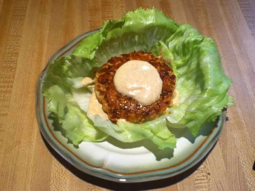 Prepare your lettuce wrap (I use 2 large leaves for each burger) with a healthy dose of the chili mayo sauce. You don't want to skimp on the sauce.