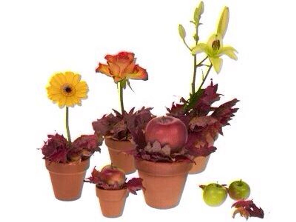 Insert a single bloom or fruit into the leaves for instant beauty. Cluster or scatter throughout the house or table for a festive look. Even add names to the small pots for places settings.