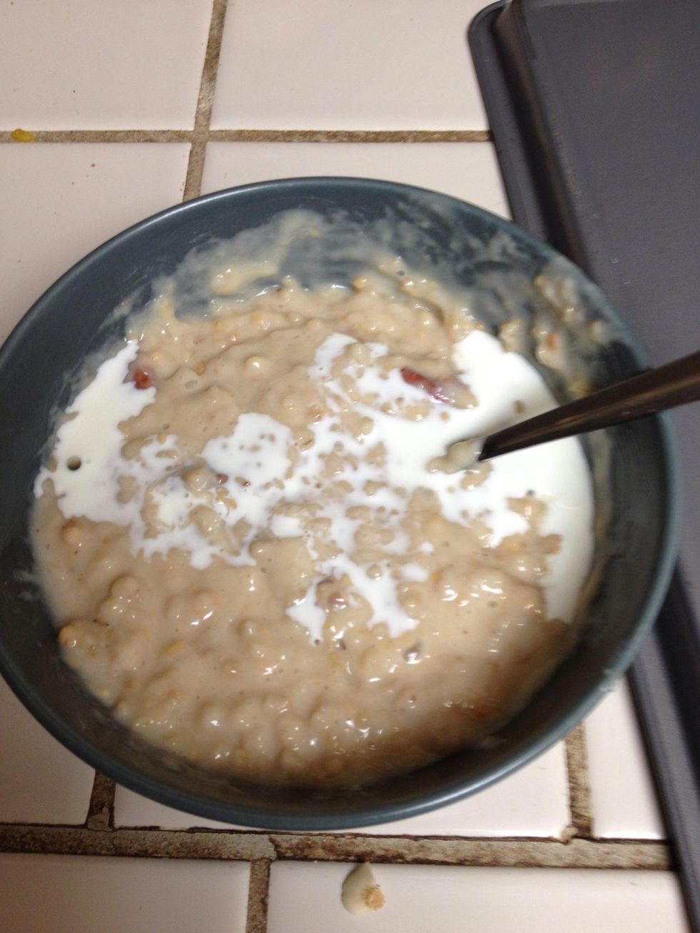 Stir in a spoonful of your choice of all natural nut butter and some sweetener of your choice, and maybe some extras too! I put pecans in today. Try some dried fruit.