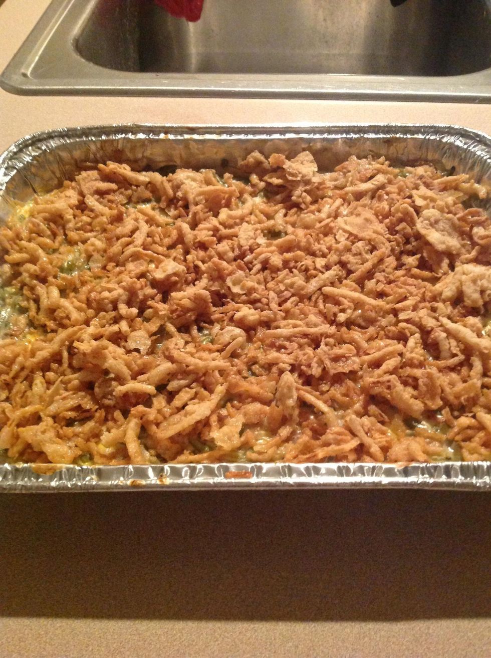 Add remaining crunchy onions to the top of casserole, if u do not want your casserole crunchy put it back in the oven for 5 min.