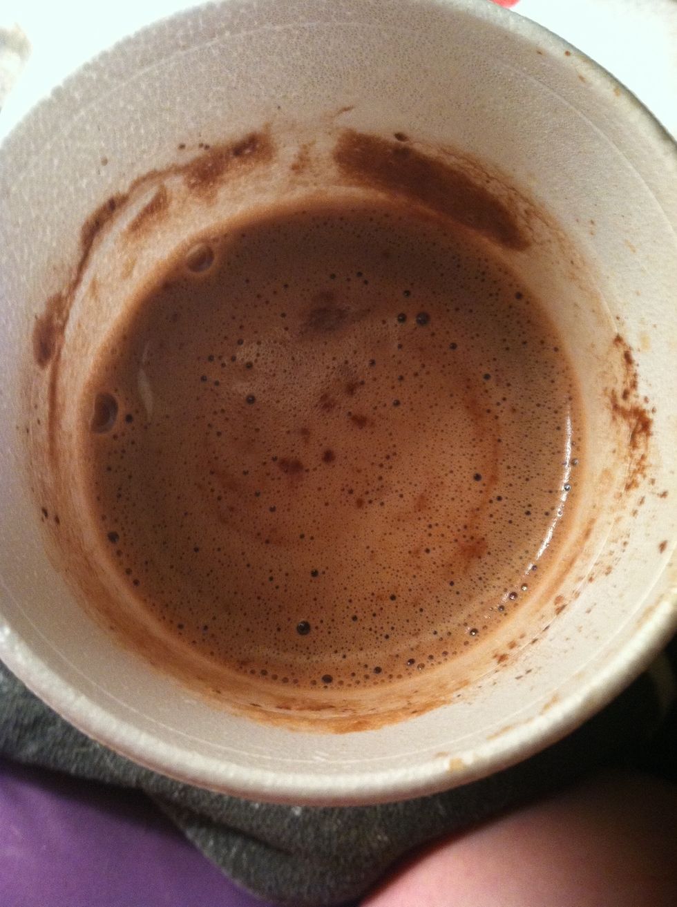 Pour the water into the coffee maker--let it work it's magic!! Once the coffee is done, open up your 3 packets of hot chocolate- pour them into your mug or cup--