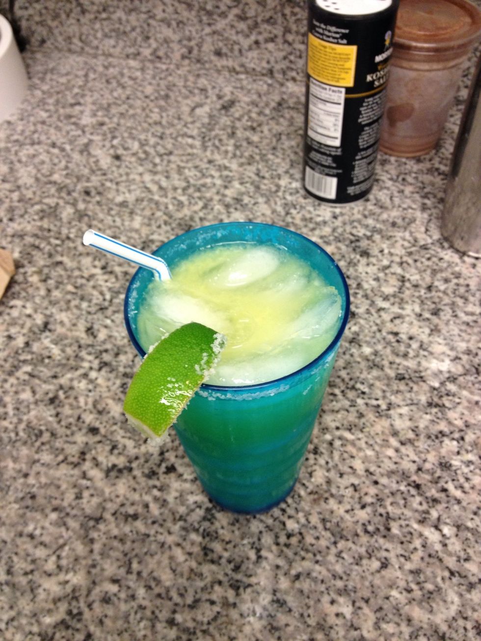 A 20 oz. Beverage Cup, filled with ice, rimmed with kosher salt, & garnished with lime