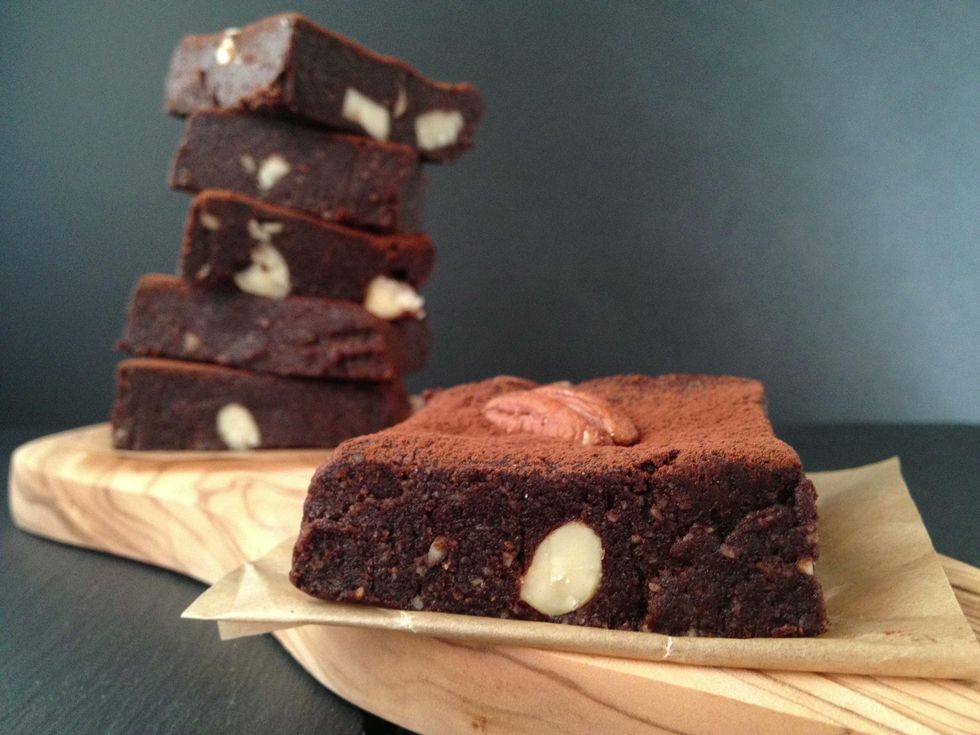 Remove from fridge and pull out the baking paper to release the brownies. Dust with cocoa / cacao and if you wish to be super swish, decorate it with pecans or walnuts.