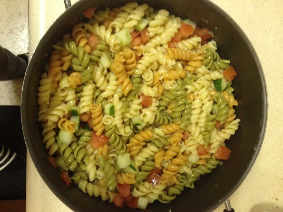 Pour rotini back into the pot or into a large bowl and mix in the veggies. Then, pour in the Italian dressing and stir well. I used most of the bottle to make it real moist so it wouldn't dry out.