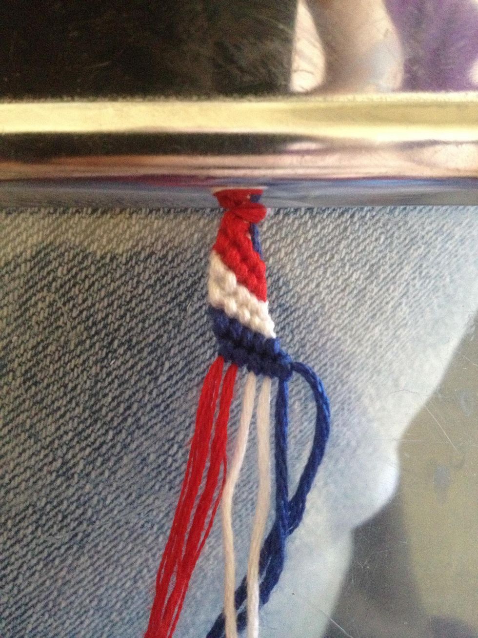 Once you have the first knot done, take the same red string and make a knot on the next color. In this bracelet it would be white. Continue to make knots on all the remaining strings.