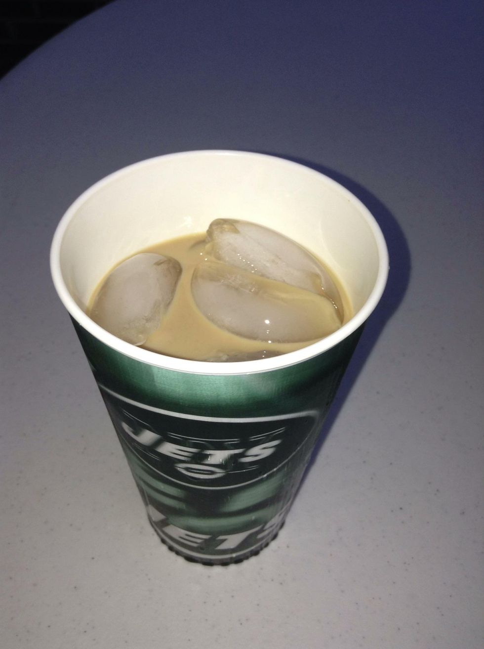 Mix 1/4 cup coffee brewed previously + 1/2 cup cold water + 2 tablespoons coffee mate creamer in drinking glass.