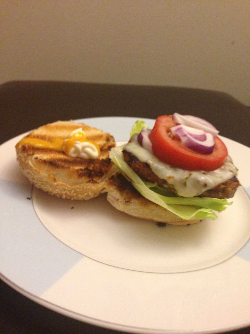 Add lettuce, tomato and onion. On the top bun put mayo along with your fav. Hot sauce