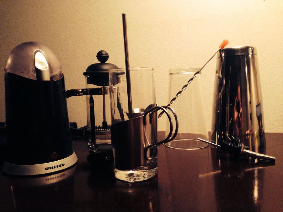 Get your kit ready: a cafetiere, a grinder, an Irish Coffee glass, a long metal spoon, a bar spoon (optional), a jigger (optional), a speed pourer (optional), and a Boston or cobbler shaker (optional)
