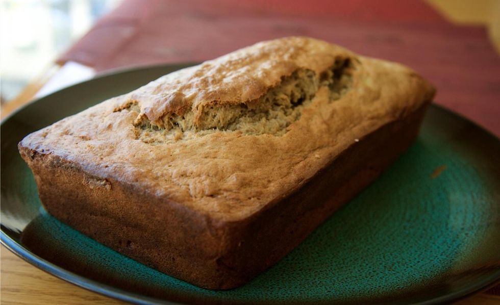 Take your black bananas, remove peels, and mix into batter. Beat well! Pour batter into greased loaf pan.