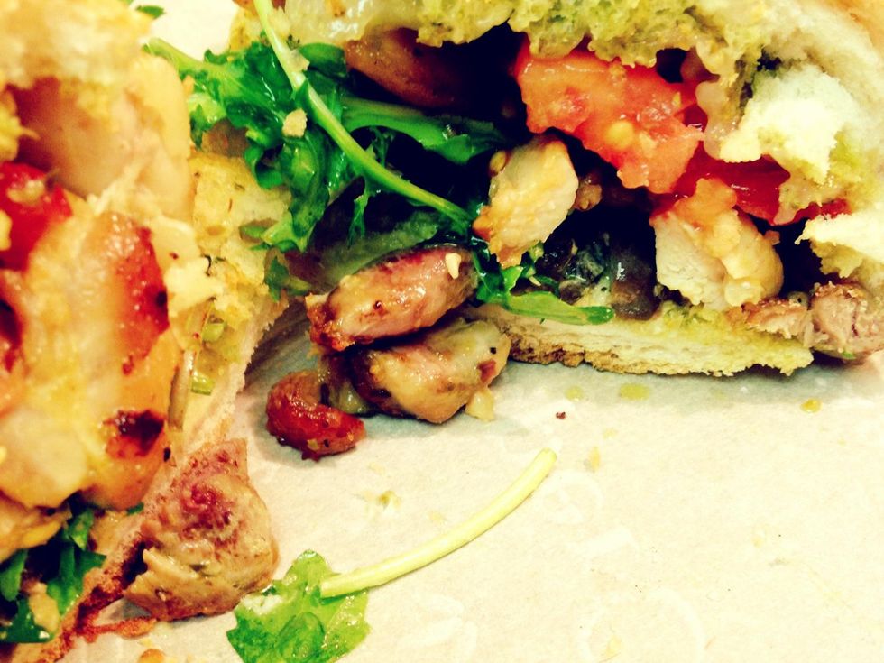 Add chicken to pan and cook through. When finished, mix in pesto.