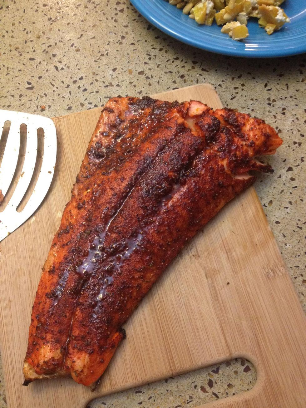 Get the salmon rub by Tom douglassalmonPut olive oil on salmonPut salmon rub on olive oil covered salmon and rub inRub till coveredPut in grill medium heat, shut lid and cook till done.Yummy salmon! All done
