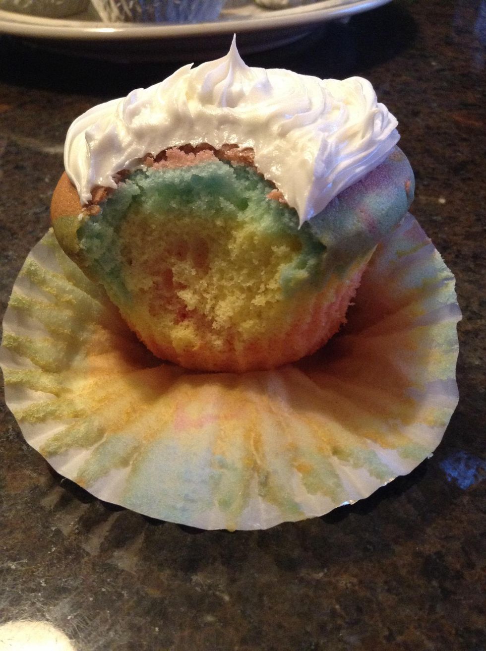 Follow the directions on the food coloring box to color each bowl of cake mix: red, orange, yellow, green, blue, and purple.