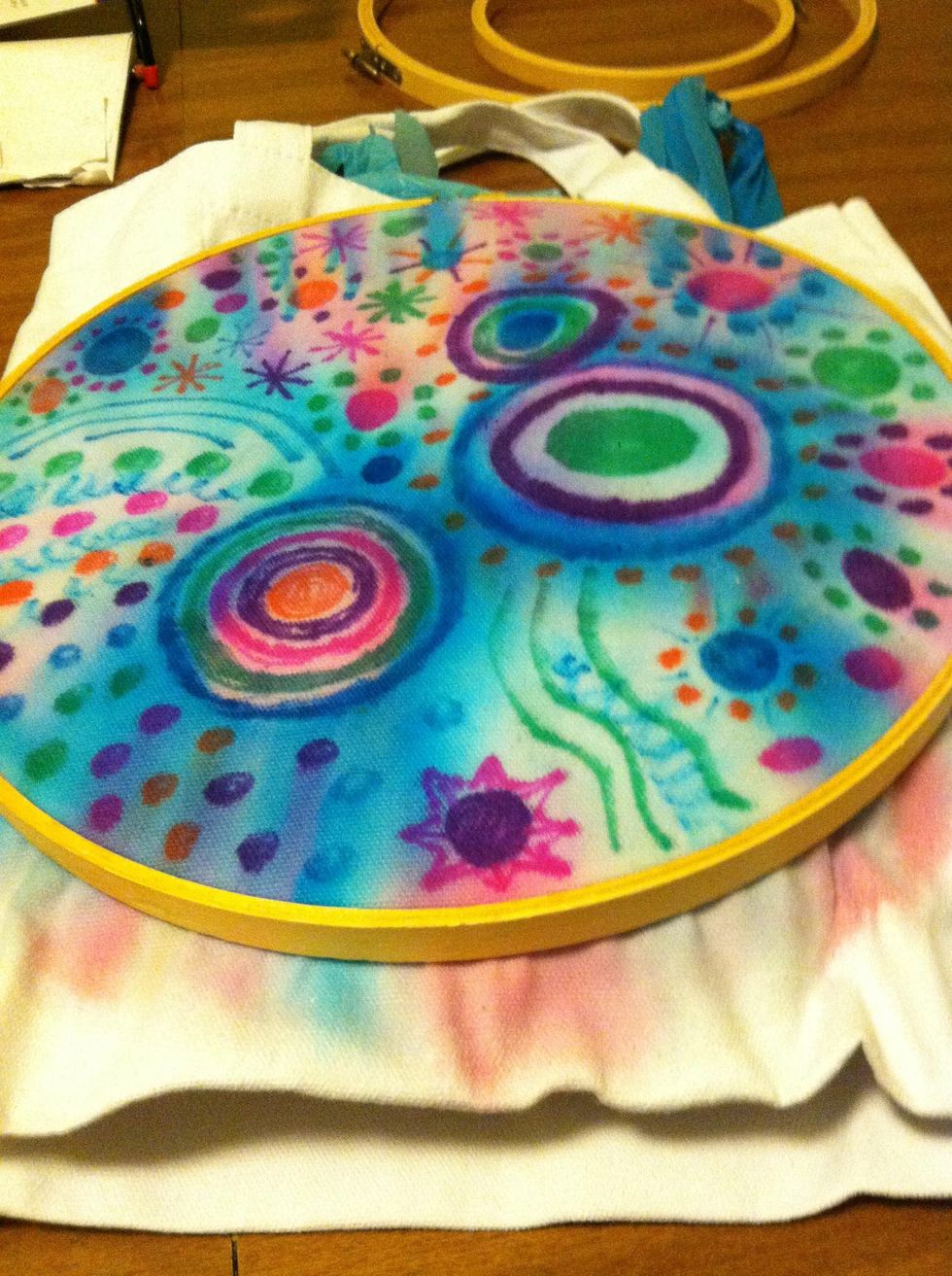 I centered my hoop on my bag and stuffed it with plastic bags to keep the colors from running through to the other side.