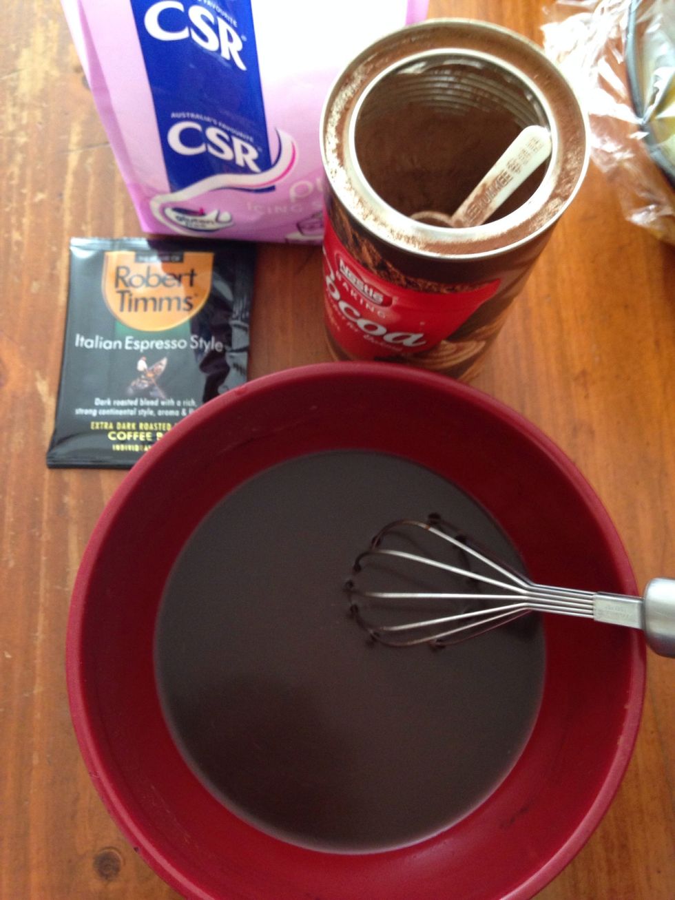 Combine 1 cup of the icing sugar and the cocoa in a large bowl and slowly whisk in hot water, mix to a smooth and runny sauce. Whisk in coffee and leave to cool at room temperature.