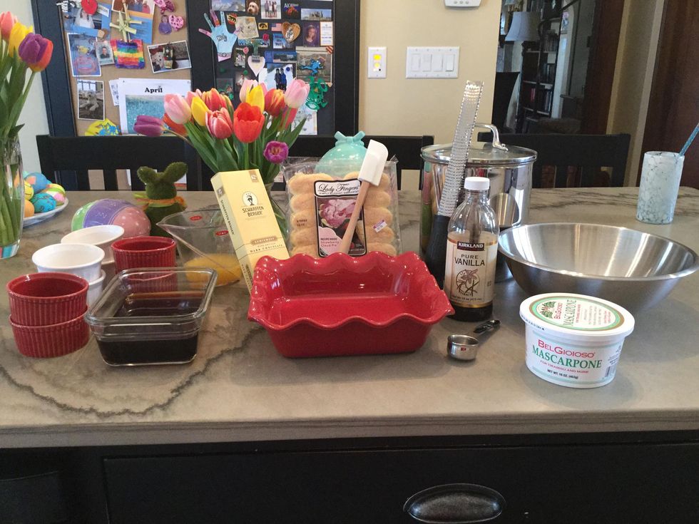 First, put the sugar in the coffee and stir it to dissolve. Next, dip each ladyfinger in the coffee mixture and arrange in a 9x9 baking dish in a tightly packed layer.