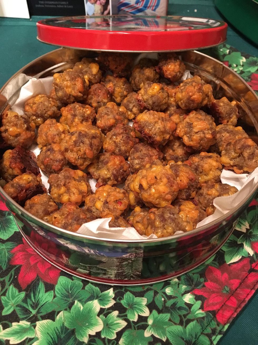 Blend together sifted Bisquick, shredded cheese, onion powder, garlic powder and uncooked sausage. I use about 1 to 2 teaspoons of each powder. Based on your preference you may want more or less.