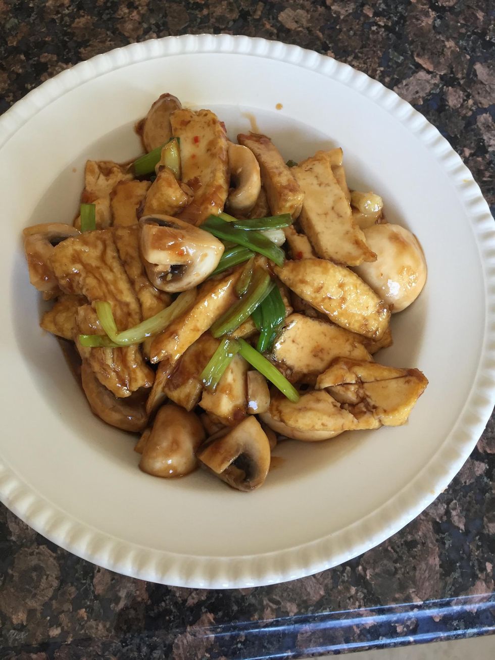 Fry green onionsAdd mushrooms and tofuAdd hoisin sauce and chili sauceAdd sweet chili sauceDone! So simple!