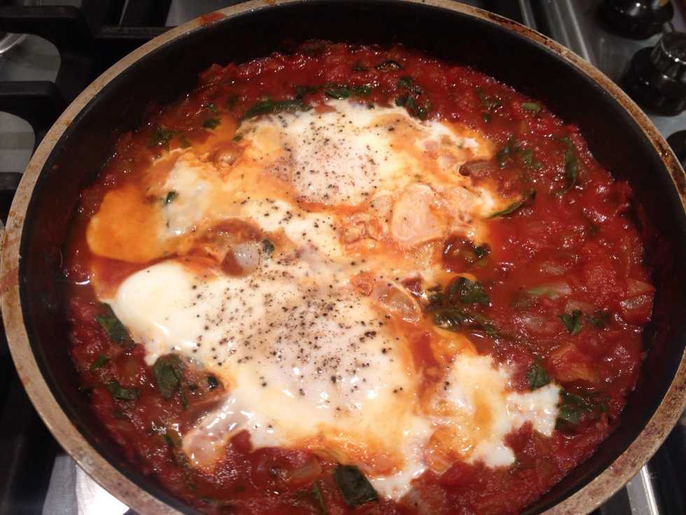 Make two indentations in the sauce and crack a whole egg into each. Put the lid on the pan and leave to cook on a low heat for about 5 mins until the white is firm but the yolk is still runny.