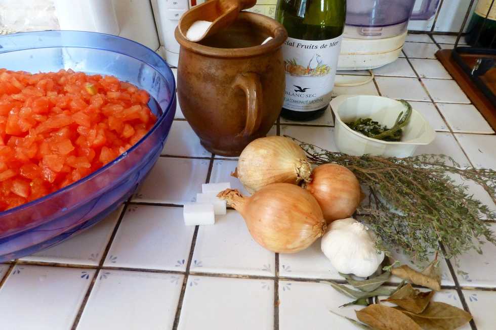 Put the tomatoes in a large saucepan (or in a bowl jam) with wine, bouquet garni, onion and garlic x and cook 30 minutes over medium heat. Add the sugar and salt, cook 5 minutes.