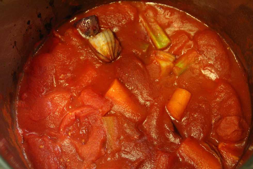 Get your ingredients readyAdd a tablesppon of olive oilAdd you canned tomatoesAdd your chopped vegetables and a pinch of saltKeep on stove and cook for a few hours
