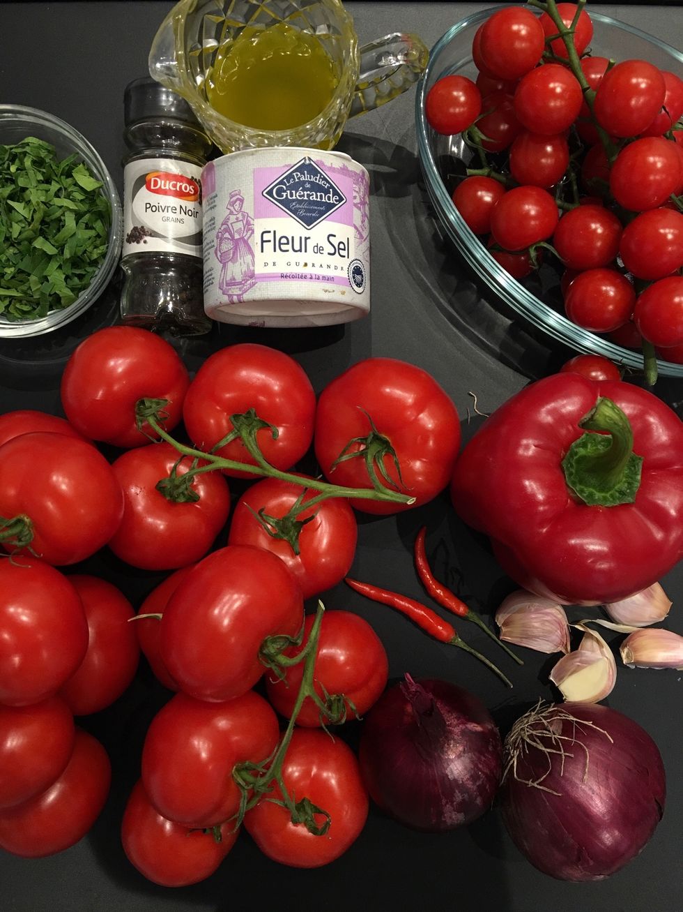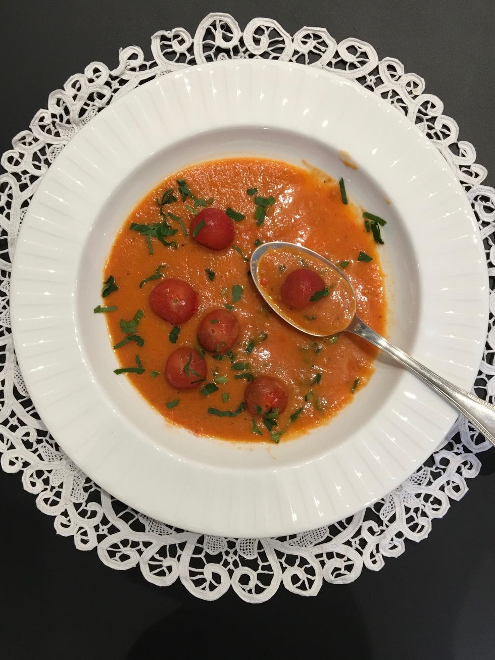 Serve in a heated wide based soup dish or (pasta dish). Add the warm and peeled cherry tomatoes