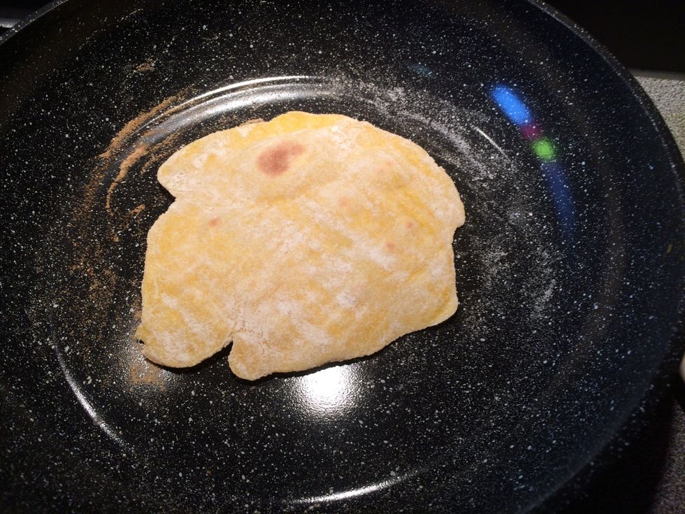 Place one of the tortillas on to the pan and cook for 2 minutes on each side.
