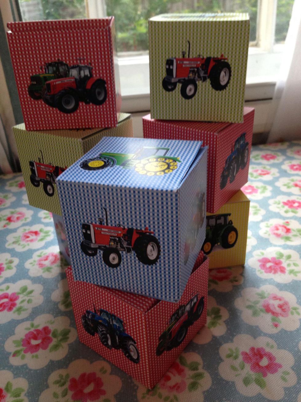 Here are your pretty tractor boxes. I'm filling mine with dried fruit.