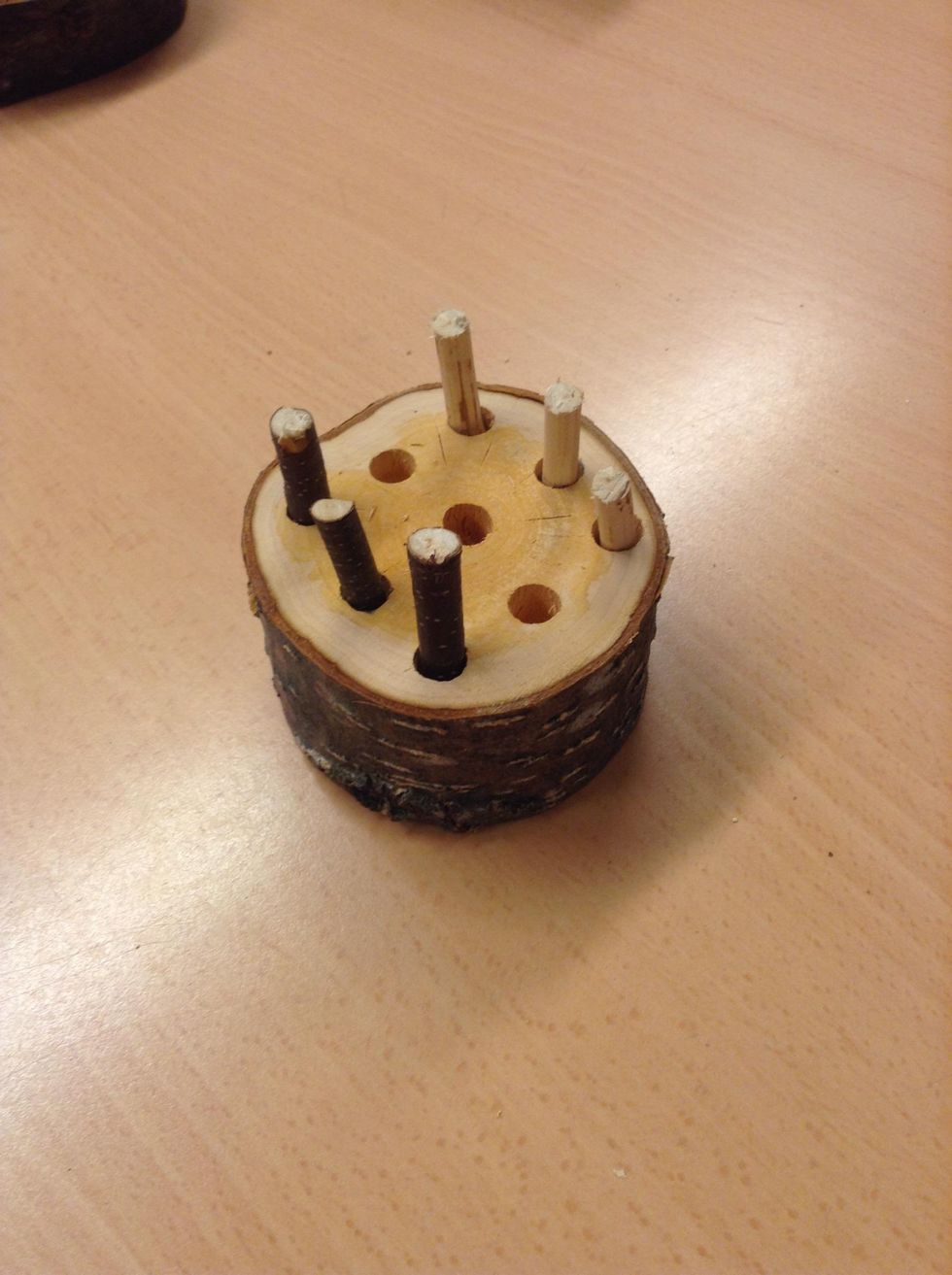 Märk ut nio punkter.Borra en cm djupa hål.Prova ut lagom tjocka pinnar.Skala ena pinnen.Såga av pinnen i lämplig längd.