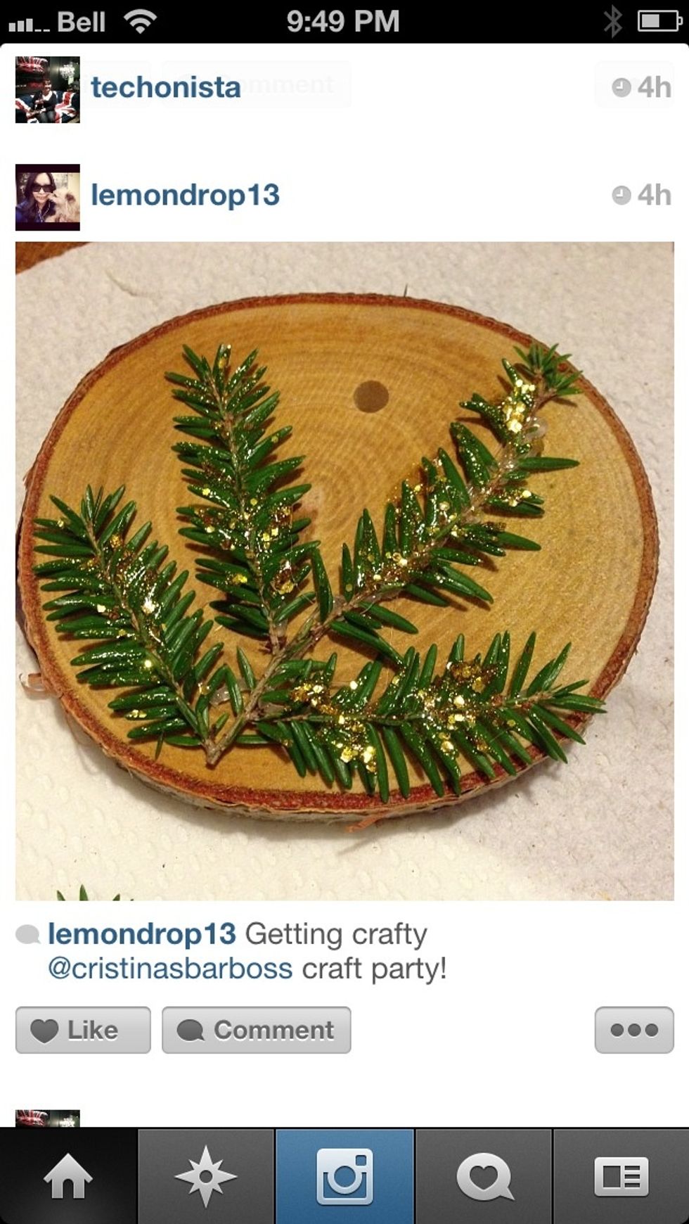 Cristina's Fab Craft Party Project!... Saw a tree branch into discs and drill a hole through each disc.