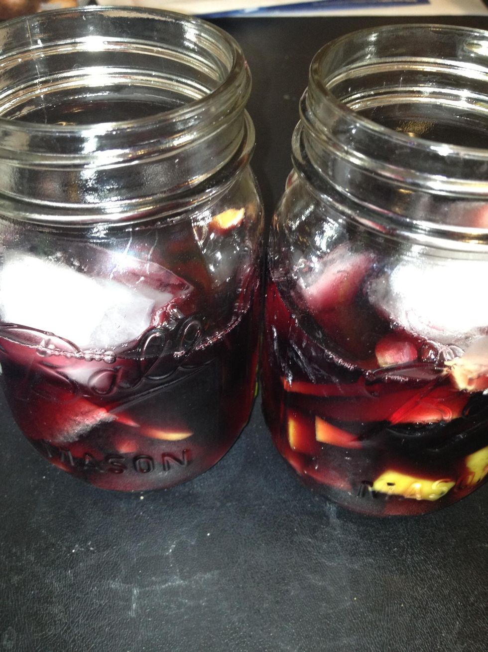 Slice mangoes and strawberries into small chunks and add to bottom of mason jarSlice apple thinly and place on top of other fruitAdd a few cubes of iceAdd Sangria wineEnjoy your summer fruity drink!