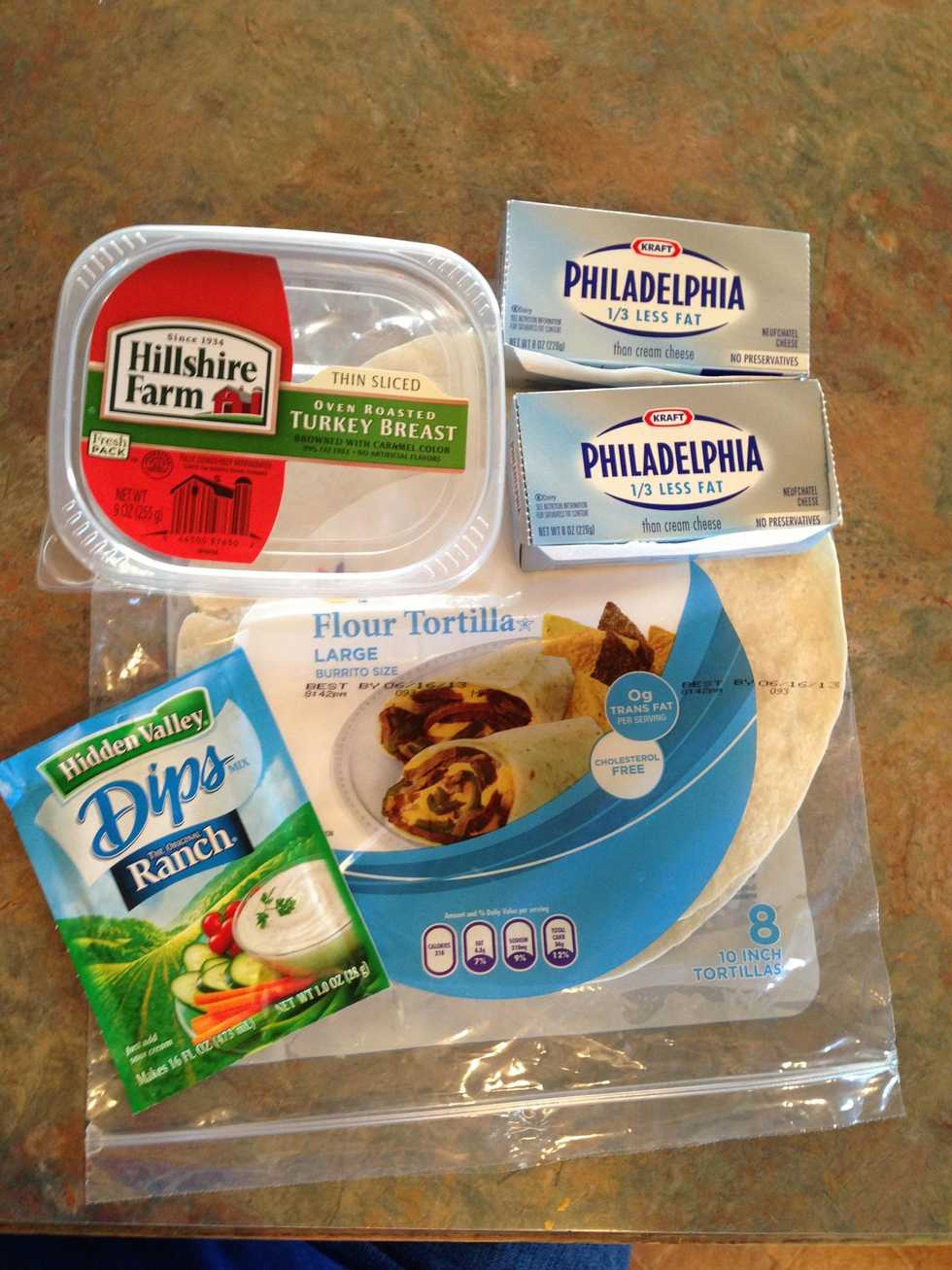 Place one layer of turkey on top of the part of the tortilla with the cream cheese/ranch mix on it.