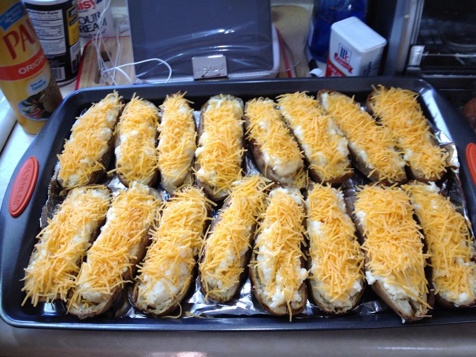 What you needCut in half long waysCut like thisScrap all the potato out be careful not to break the skinNice and smoothFill the skins upSkins fullTop with cheese and maybe bacon