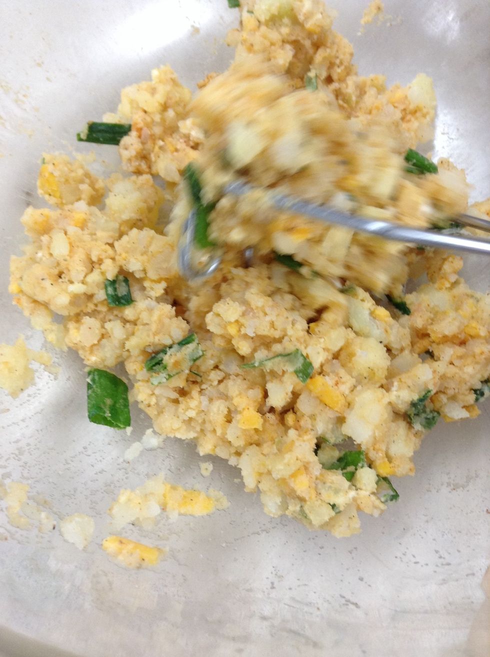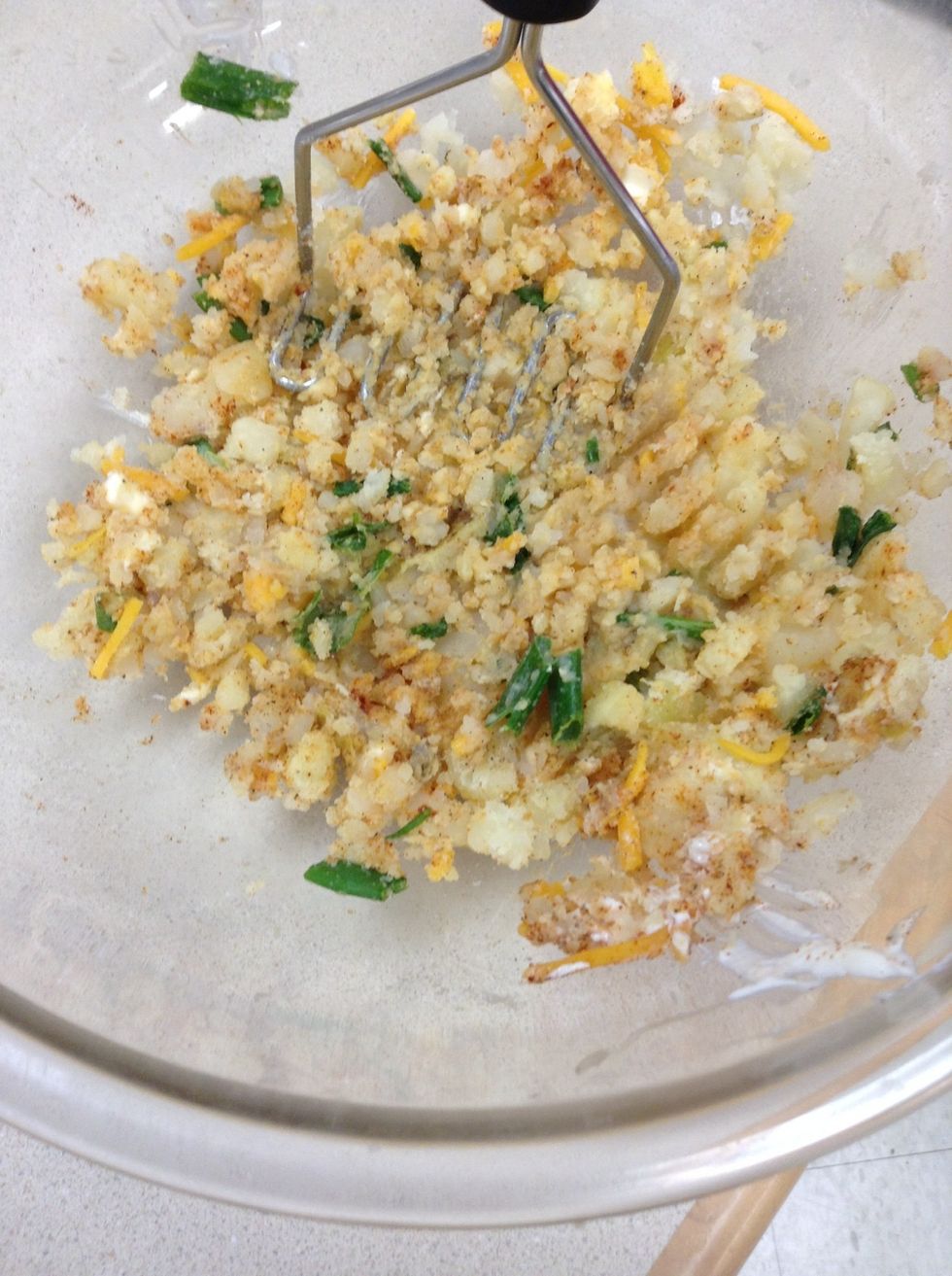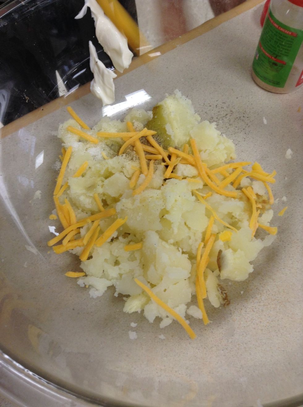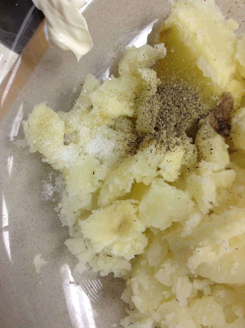 Add milk too (roughly 1 tablespoon) and then mash it up!