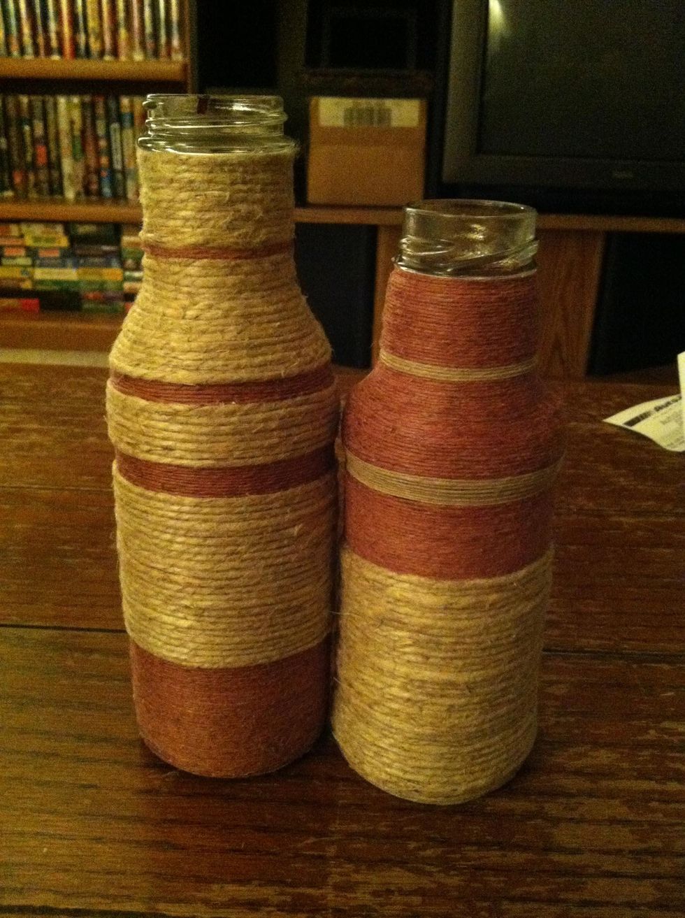 Plastic bottles can work too but I prefer the weight of glass because I'm going to put flowers in them. For a colorful, kid friendly variation use bright braiding cord.