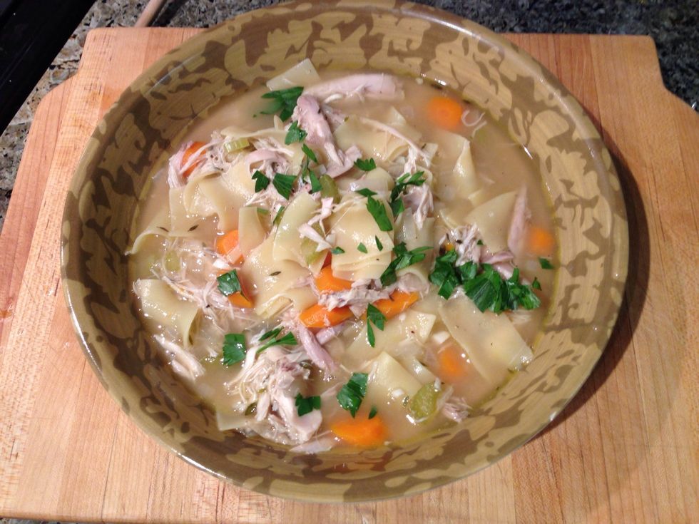 Add the noodles, simmer uncovered for 5 minutes and them fold in the chicken and simmer another few minutes. Season with salt and pepper to taste. This step is crucial, btw.