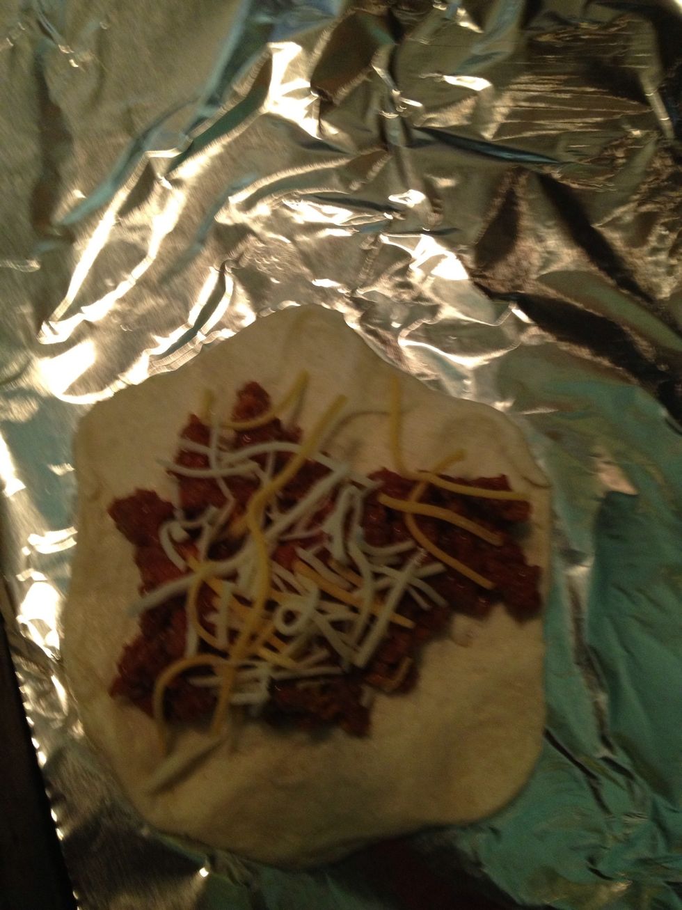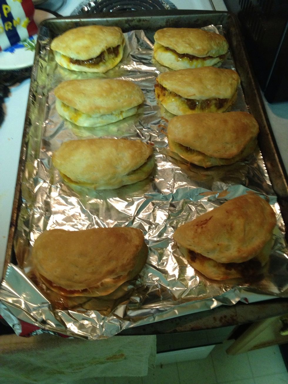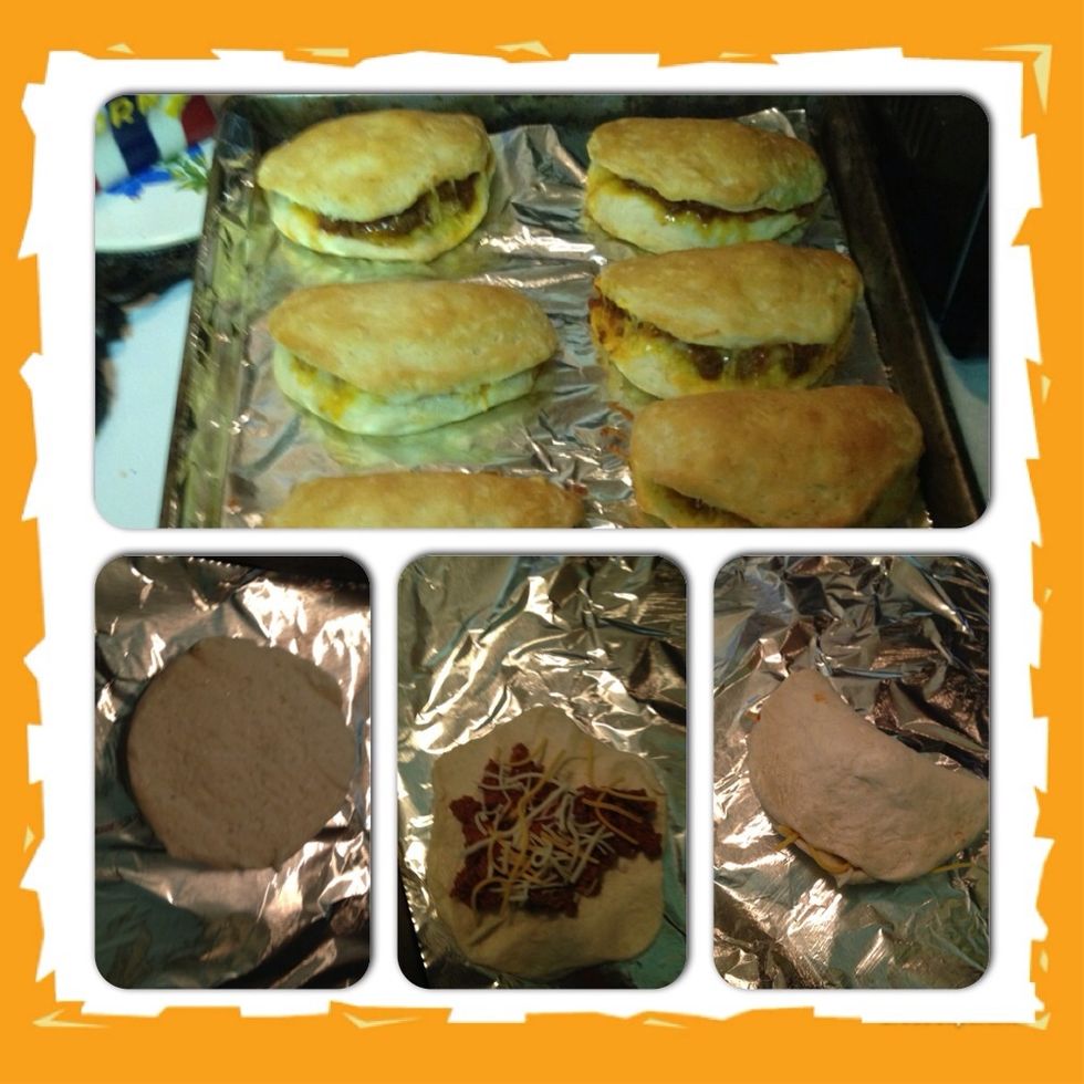 Scoop about 1 tbsp of meat onto biscuit and sprinkle some cheese.