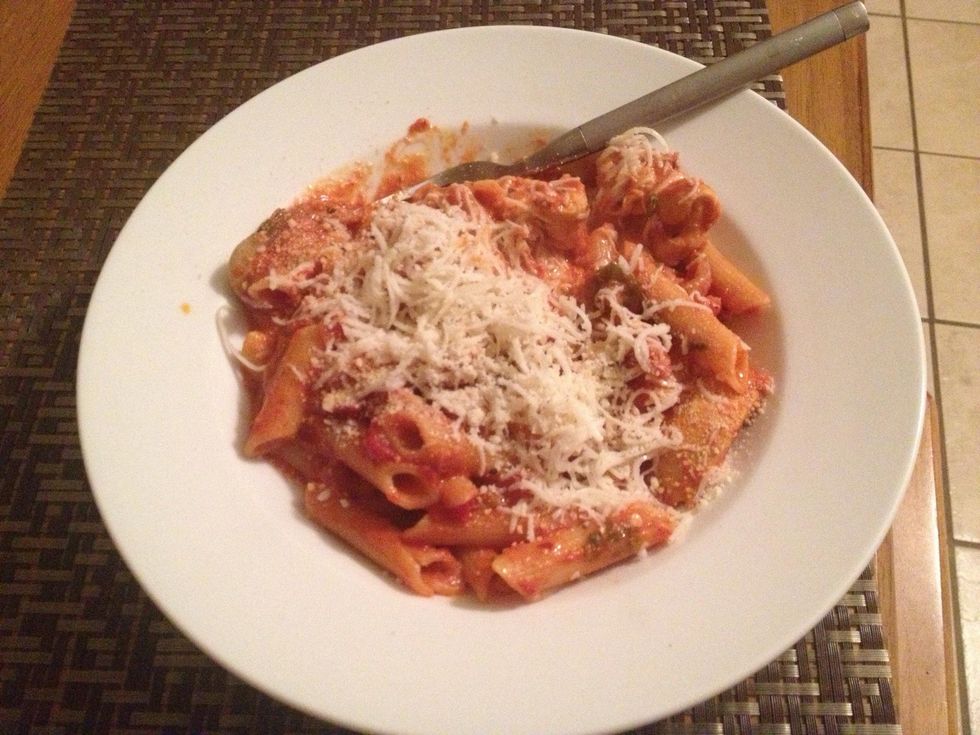 Once vegetables and chicken are cooked. reduce heat to low and combine pasta sauce to cooked vegetables and chicken.