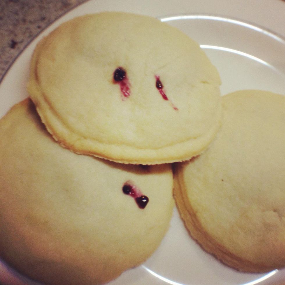 Grab a toothpick and poke 2 nice holes into the top layer of cookie (like a vampire bite!) so that you reach through to the jam in the centre.